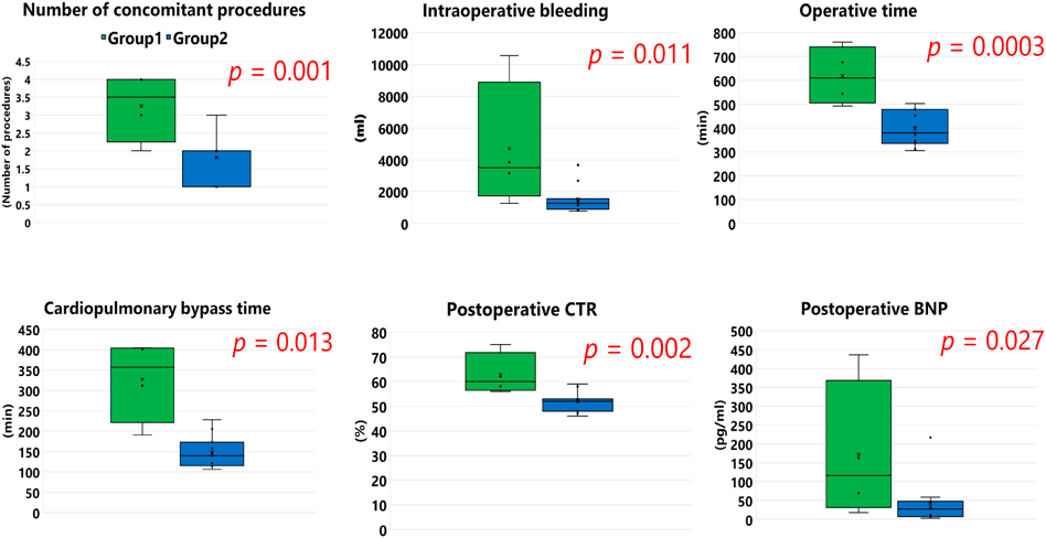 A median number of concomitant procedures was 3.5 [2.8–4.0] in Group 1 and 2.0 [1.5–2.0] in Group 2 (p=0.001). The median operative time was 610 minutes [531–697] in Group 1 and 380 minutes [341–466] in Group 2 (p=0.0003). As shown in Fig. 1, other results were also significantly lower in Group 2 such as cardiopulmonary bypass time, amount of blood loss, post-operative cardio-thoracic ratio, and postoperative serum brain natriuretic peptide level. Serum concentration of brain natriuretic peptide was measured at 5.8 months [3.8–10.8] after PVR in Group 1 and 37.6 months [33.7–134.0] in Group 2; chest X-ray was checked at 9.8 months [6.2–13.9] postoperatively in Group 1 and 40.4 months [36.3–131.2] in Group 2.