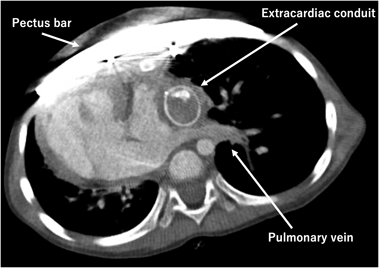 In our case, simultaneous repair was considered necessary to secure the Fontan pathway by correcting the pectus excavatum; compression to the Fontan route and the pulmonary veins were avoided. As anticipated preoperatively, postoperative CT revealed that the Fontan conduit occupied a considerable space within the thoracic cavity. The pulmonary veins appear better structured than preoperative state.