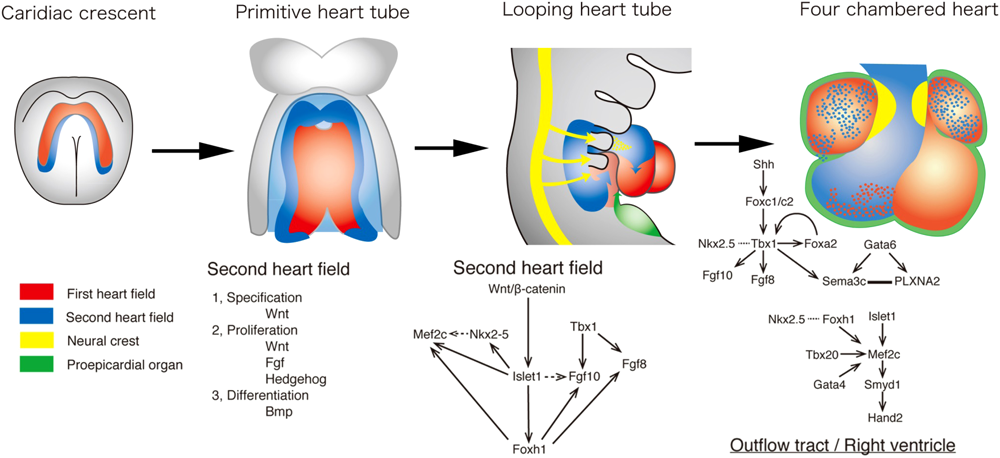In addition to the FHF, the second source of cardiac progenitor cells, termed the “second heart field (SHF)” lies medially to the cardiac crescent.2–4) During the primitive heart tube formation, the heart tube derived from the FHF may provide a scaffold upon which cells from the SHF migrate into both the arterial and venous poles of the heart tube. Upon rightward looping of the heart tube, SHF cells cross the pharyngeal mesoderm into the anterior and posterior portions, populating a large portion of the outflow tract (OFT) of the heart, the future right ventricle, and a part of atria.