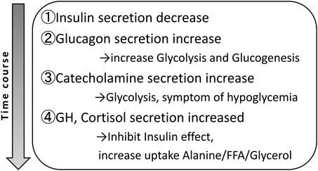 During hypoglycemic attacks, insulin secretion is first reduced and glycogen levels are increased. Next, catecholamine levels are increased, thereby promoting glycogenolysis and causing the appearance of hypoglycemic symptoms such as palpitations and cold sweats.22) When symptoms are prolonged over a few hours, growth hormones and corticosteroid hormones are activated, which increases catecholamine activity and maintains blood glucose levels.26) In other words, in the mechanism underlying blood glucose maintenance, catecholamine plays a key role in the control mechanism (Fig. 2).27)