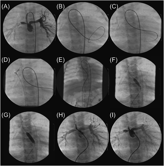 At 9 months of age, cardiac catheterization and angiography were performed to consider further therapeutic strategies because of increasing cyanosis. During the study, a guide wire advanced from a catheter placed into the central shunt happened to retrogradely pass through the pulmonary valve, and her diagnosis was corrected to be ESPS. The main results included a SaO2 of 78%, Qp/Qs of 1.3, mean right and left pulmonary artery pressures of 13 and 18 mmHg, respectively, and a PA index of 127 mm2/m2. Then, we attempted BPV with an FA–SPS–FV wire loop with a strategy to perform a bidirectional Glenn procedure following coil embolization of the main parts of APCAs several months later. Informed consent was obtained from the parents. The pulmonary valve annulus was 7.0 mm in diameter (Z value, −4.2).