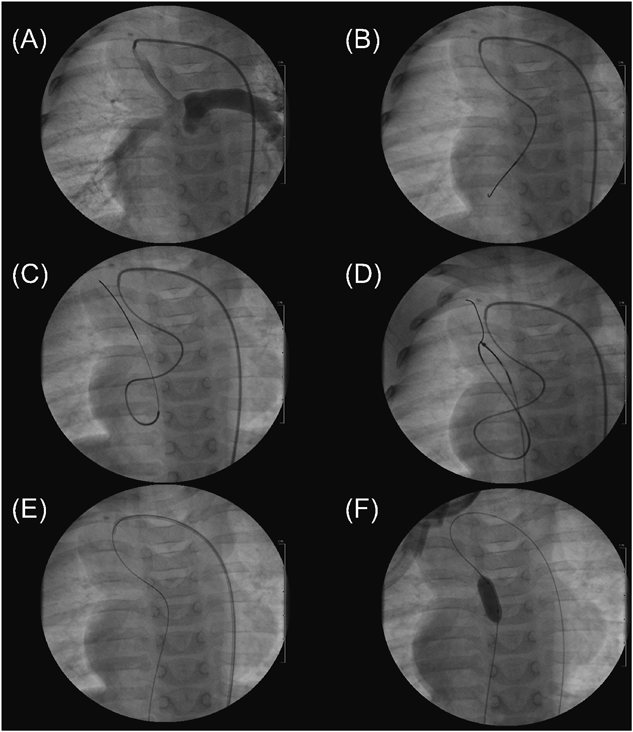 First, a 0.035″ Radifocus guidewire and a 4-Fr Cobra-shaped Glidecath were advanced to MPA through the central shunt via the right FA sheath. We could then pass the wire through the pinhole-like pulmonary valve (Pin-PV) and followed the Glidecath into the left ventricle (LV). Through the Glidecath, a 2.3–2.8 Fr microcatheter (Prowler Select Plus, Codman), the tip of which we bent into U shape, was advanced into LV. Next, from the microcatheter, we carefully advanced a 0.016″ GT wire into the superior vena cava (SVC) through the mitral valve (MV). We caught the wire with a 10-mm diameter snare catheter, which was advanced via the right FV sheath, and pulled the wire out of the body to make an FA–SPS–FV wire loop. Third, from the FV sheath, we delivered a 7 mm diameter×2 cm length balloon catheter (Sterling, Boston Scientific) to the Pin-PV on the wire loop and inflated it to 10 atm (Fig. 1). With sufficient support by the wire, complications such as bradycardia, hypotension, mitral or pulmonary regurgitation, and atrioventricular block were not observed. After BPV, the pulmonary valve orifice diameter became 3.5 mm and her SpO2 increased from 75 to 85%.