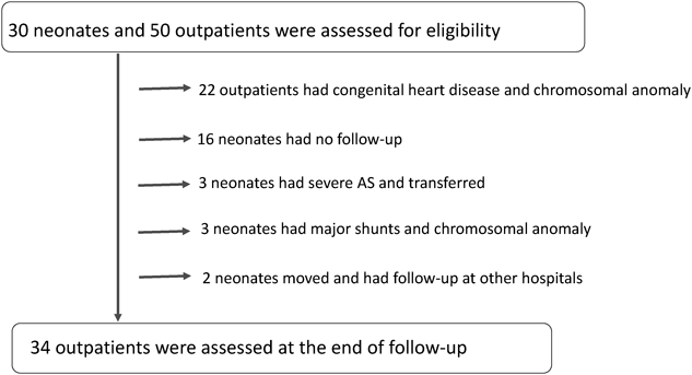 A total of 34 patients with isolated BAV: 6 of 30 infants (from a total of 11,085 who underwent screening) and 28 of 50 outpatients were followed up during the study period. The enrollment and follow-up of patients are described in Fig. 1. The general characteristics of the study population at the first observation are shown in Table 1.