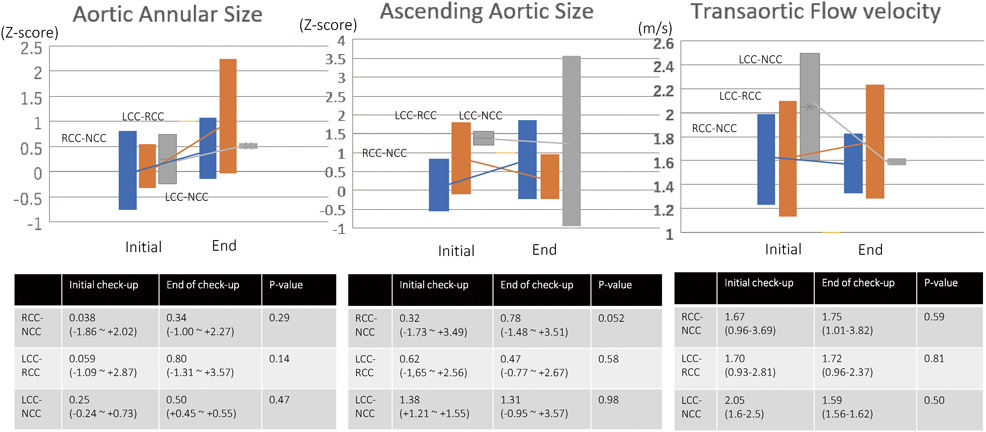 The data on the aortic valvular annular sizes according to the fusion site of BAV are shown in Fig. 2. The Z-score of the average valvular size of all patients with right-noncoronary cusp fusion (R-N fusion) (n=21; average follow-up period, 5.39 years) increased from 0.038 to 0.34 (Fig. 2). The valvular size increased from 0.059 to 0.80 in those with left coronary and right coronary cusp fusion (L-R fusion) (n=11; average follow-up period, 5.8 years) and from 0.25 to 0.50 in those with left-noncoronary cusp fusion (L-N fusion) (n=2; average follow-up period, 4.5 years). However, significant differences were noted between the initial and final checkup findings among all fusion types, and there were 5 patients (L-R, n=3; R-N fusion, n=2) whose annular size was enlarged (Z>2) at the final checkup. Four of them had AR (mild, n=2; moderate, n=2). One patient had a small (Z<−2) valvular size and AS (transaortic flow velocity=3.7 m/s). The valvular size in all patients with simple BAV increased significantly, but no marked changes in the annular size were observed between the initial and final checkup among patients with progressive AR or AS.