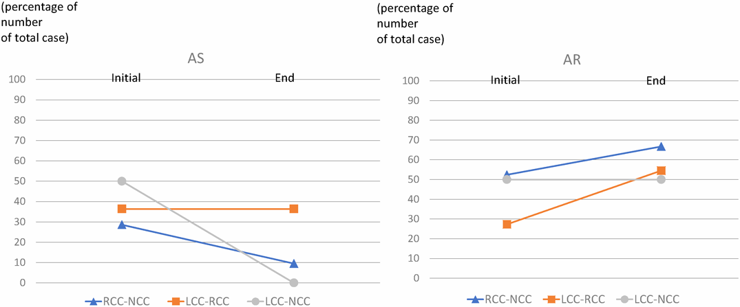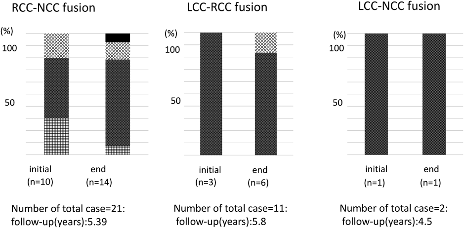 Figs. 3, 4 show that AS remained unchanged or was improved in six patients during the follow-up period across all types of fusion. The average transaortic flow velocity did not change to a significant extent (Fig. 2). Fig. 3 shows the changes in AS in patients with the different types of fusion: among patients with R-N fusion, AS improved in 4 patients; among patients with L-R fusion, AS improved in one patient and progressed in one patient; among patients with L-N fusion, AS improved in one patient and remained unchanged in one patient.