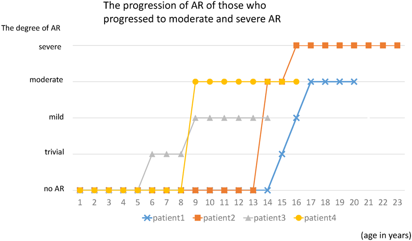 In contrast to our findings with AS, the outcomes of AR were aggravated. Once AR was detected, the degree progressed or remained unchanged in most cases. Fig. 3, 4 show that AR tended to progress gradually. At the final checkup, AR was observed in 14 patients (67%) with R-N fusion, 6 patients (55%) with L-R fusion, and 1 patient (50%) with L-N fusion. Among 21 patients with AR at the final checkup, the degree of AR was mild in 16 patients (76%), moderate in 3 patients (14%), and severe in 1 patient (5%). There were four patients (R-N fusion, n=3; L-R fusion, n=1) whose state of AR was moderate or severe. AR was aggravated from mild, to moderate or severe in patients of 8–20 years of age (Fig. 5).