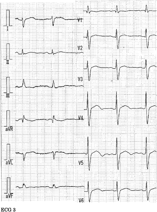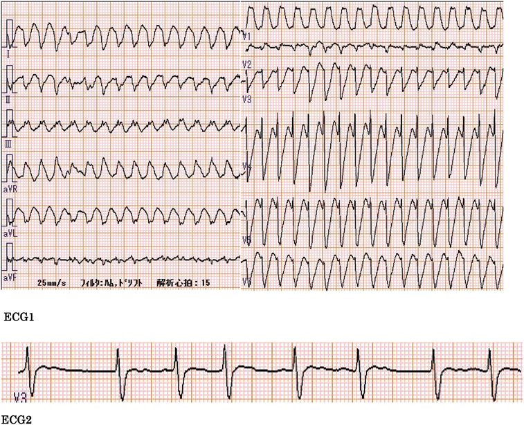 A 13-year-old girl was referred with complaints of general fatigue and palpitation that occurred for the first time after exercise. During physical examinations, she was drowsy, and her systemic systolic blood pressure was very low up to 60 mmHg. The electrocardiography revealed the wide QRS tachycardia (Fig. 1, ECG1), in which a rapid bolus injection of adenosine triphosphate did not make any changes. Even though the atrial response could not be identified in very rapid rhythm, VT was strongly suspected, and a synchronized cardioversion successfully treated the tachycardia. An irregular ventricular rhythm then followed for half a day (Fig. 1, ECG2) and returned to the sinus rhythm spontaneously. We assumed this irregular rhythm was AFib because of being without any distinct P waves. Echocardiography, coronary CT and gadolinium enhanced cardiac MRI were normal. Blood tests revealed the elevation of serum creatine kinase levels (1600 U/L). She also showed foot deformity, facial muscle weakness, intraventricular conduction delay (Fig. 2), and a history of respiratory difficulty in the neonatal period, which suggested the presence of muscular dystrophy. A genetic examination revealed CTG expansion on the myotonic dystrophic protein kinase gene over 1000 repeats, which gave the definitive diagnosis of CMD1.