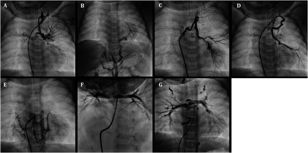 An infant weighing 3438 g was delivered vaginally at 39 weeks’ gestation. He was diagnosed with pulmonary atresia, ventricular septal defect, and MAPCAs by fetal echocardiography. In addition, rectal-cutaneous fistula, bilateral inguinal hernias, and 22q11.2 deletion syndrome were also present. He was transferred to our hospital at 3 months of age for cyanosis and diagnosed with a double outlet right ventricle, subarterial (doubly-committed) ventricular septal defect, pulmonary valve stenosis with a 52 mmHg pressure gradient involving a diminutive tethered pulmonary valve (diameter: 3.7 mm, z score: −6.4), right aortic arch, and MAPCAs via echocardiography. His clinical condition was almost stable with 75% of oxygen saturation (SaO2) at the time of admission. The first cardiac catheterization revealed five MAPCAs originating from the subclavian artery, descending aorta, and celiac artery (Fig. 1A–E), and a diminutive native PA (PA index [PAI] 49 mm2/m2)6) (Fig. 1F). Each MAPCA had sufficient dual supply with the native PA. In other words, the native PA was connected to the entire pulmonary vascular field. The initial BVP was performed with full expansion of a 5.0 mm Tyshak II balloon (NuMED, Hopkinton, New York). Immediately after balloon deflation, the patient’s SaO2 increased to 85% and TAE of the four MAPCAs was performed in order to promote rehabilitation of the native PA. The post-interventional course was uneventful, and SaO2 was 85% at discharge from the hospital. At 7 months of age, he received a second cardiac catheterization. The native PA had grown to a PAI of 87 mm2/m2 and TAE of the minor aortopulmonary collateral arteries was performed. Because of the onset of cyanosis, a third cardiac catheterization was performed at 11 months of age. The native PA had grown to a PAI of 137 mm2/m2 and the second BVP was performed for the pulmonary valve (diameter: 6.5 mm, z score: −3.6) with full expansion of 7.0 mm and 8.0 mm Sterling balloons (Boston Scientific, Natick, MA). The patient’s SaO2 increased from 75% to 85% and TAE of the one remaining MAPCA was performed. After bilateral inguinal hernia repair surgery, a final cardiac catheterization was performed at 20 months of age. It revealed good pulmonary vascular condition with acceptable mean pulmonary artery pressure (15 mmHg), pulmonary vascular resistance (1.8 U・m2) and PAI (135 mm2/m2 :Fig. 1G). TAE of the residual minor collateral arteries was performed. During this period, pulmonary valve regurgitation remained at a mild level. At 25 months of age, he underwent a complete repair with a transannular patch. The postoperative course was uneventful, and echocardiography indicated acceptable right ventricular pressure; tricuspid regurgitation velocity was 3.1 m/s and inter-ventricular septum was round during systole in short axis view.
