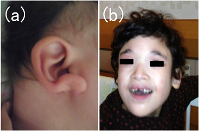 The patient is an 11-year-old girl who was born as the third child of consanguineous parents. A heart murmur and stridor was heard after birth and the patient was transferred to the NICU, where the diagnosis of pulmonary artery sling, secundum atrial septal defect and tracheal stenosis was made. Her CHD was repaired during her initial hospitalization. She had a characteristic facial appearance with medially flared eyebrows, hypertelorism, telecanthus, uplifted ear lobes and a pointed chin (Fig. 1(b)). At age 3, a prolonged seizure episode occurred, accompanied by an abnormal electroencephalogram pattern of diffuse, high amplitude, spike-and-wave activities. Together with severely impaired speech, frequent laughing, happy disposition and facial features, her manifestations were suggestive of Angelman syndrome. However, genetic workup, including copy number analysis of the 15q11–q13 region, methylation analysis of SNRPN and UBE3A sequencing had all turned out negative, obscuring a definite diagnosis.