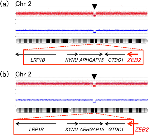 Later in life, microcephaly and severe developmental abnormalities became gradually manifest. At age 11, she still could not stand unaided and no intelligible words could be heard. In search of an etiology explaining her multiple anomalies, CMA testing was performed. CMA testing established a molecular diagnosis of MWS by revealing a 4.5 Mb deletion (arr[hg19] 2q22.1q22.3 (140,569,236–145,155,731)×1), involving exon 9–10 of the ZEB2 gene (Fig. 2(b)). Parental testing confirmed de novo occurrence of the deletion.