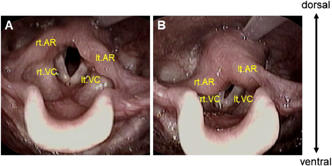 (A) on inspiration, (B) on expiration. rt.VC, right true vocal cord; lt.VC, left true vocal cord; rt.AR, right arytenoid; lt.AR, left arytenoid.