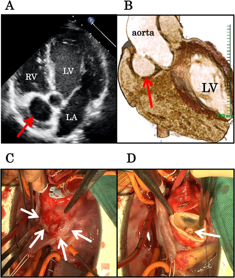 A 10-year-old boy was admitted to our hospital with fever of unknown origin. He had undergone percutaneous balloon aortic valvoplasty for congenital aortic valve stenosis when he was 2 years old. The initial pressure gradient at the aortic valve was 60 mmHg before valvoplasty. After percutaneous aortic valvoplasty, it decreased to 40 mmHg. The patient exhibited trivial aortic valve regurgitation. The balloon size was 95% of the aortic valve size. At the time of the current admission, his blood pressure was 100/60 mmHg; heart rate, 90 bpm; and respiratory rate, 16 breaths per minute. His body temperature was 38.0°C. Physical examination revealed a Levine-III/VI systolic-ejection murmur at the second right intercostal space. Laboratory investigations showed leukocytosis (14,000 cells/mm,3) 70% polymorphonuclear leukocytes), and his C-reactive protein level was elevated to 6.5 mg/dL. A chest radiograph showed no obvious signs of pneumonia or pulmonary congestion. Electrocardiography revealed sinus rhythm and no other abnormalities. The echocardiogram showed aortic valve stenosis, with a peak aortic pressure gradient of 40 mmHg. The parasternal long-axis view revealed vegetation attached to the aortic valve of the noncoronary cusp. We noted a thickened bicuspid aortic valve. Considering the size of vegetation, aortic valve stenosis was not caused by the vegetation. He was diagnosed with infective endocarditis of the aortic valve and treatment with aminobenzyl penicillin (200 mg/kg/day) for 6 weeks and intravenous gentamicin (3 mg/kg/day) for 2 weeks was initiated. Blood cultures obtained at the time of admission revealed the growth of Streptococcus mitis. After antibiotic administration, his body temperature returned to within the normal range 2 days after admission. However, echocardiography after antibiotic therapy showed an abnormal cavity near the ascending aorta (Fig. 1A). Although we performed echocardiography once per week during therapy, we did not detect the aneurysm until then. Contrast-enhanced computed tomography (CT) showed a defect in the right anterior wall of the ascending aorta, 5 mm above the aortic valve, and a pseudoaneurysm originating from the defect (Fig. 1B). Figures A and B are images obtained after 6 and 7 weeks of antibiotic treatment, respectively. The patient subsequently underwent ascending aortic replacement with a J graft (18 mm) to avoid rupturing the pseudoaneurysm 2 weeks after completing the antibiotic treatment. Intraoperative findings revealed a small amount of vegetation near the pseudoaneurysm entry-point (Fig. 1C, D); however, there was no sign of aortic valve infection. The postoperative course was uncomplicated, and the patient was discharged 4 weeks after the surgery.