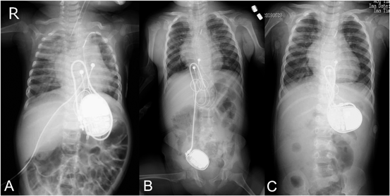 A 10-month-old female infant underwent an epicardial single chamber pacemaker implantation due to post-operative complete heart block following repair for ostium secundum type atrial septal defect (ASD). The patient was a monochorionic-diamniotic twin born at 24 weeks 5 days gestational age with a birthweight of 378 g. The pregnancy was complicated with twin-to-twin transfusion syndrome and postnatally she was managed at the referring neonatal center. She had pulmonary hypertension secondary to chronic lung disease, and remained on mechanical ventilatory support and continuous infusion of epoprostenol. She was transferred to our center for consideration of ASD closure and the surgery was performed at 10-months of age at a bodyweight of 3.0 kg. The patient developed post-operative complete heart block which did not resolve and an epicardial pacemaker implantation was performed one month post surgery. The pacing lead (4968 CapSure Epi 4968, Medtronic) was fixed to the right ventricular epicardium and the generator (Adapta SR ADSR01, Medtronic). The size of the generator was 42.9 mm in height, 40.2 mm in width, and 7.5 mm in thickness. The volume was 9.7 mL, and the weight was 21.5 g. A pocket was created under the left side of the rectus muscle, just above the posterior sheath (Fig. 1A). A part of the posterior sheath was torn because it was very fragile and thin because the patient was very small. It was very difficult to suture the torn posterior sheath. She was transferred back to the referring neonatal center 10 days post device implantation and received ongoing care until 20 months of age. Multiple complications included chronic lung disease, cerebral ventricular enlargement, optic nerve hypoplasia, retinopathy, and panhypopituitarism. She also continued to have frequent episodes of vomits which was thought to be secondary to gastroesophageal reflux. She returned to the outpatient clinic for her first routine pacemaker interrogation at 22 months. The device could not be detected by the programmer head at the original position and was noted to be in the pelvic region. An abdominal X-ray confirmed the migration of the device into the pelvic space (Fig. 1B). Although there appeared to be traction of the lead due to the generator dislocation, the lead continued to show stable thresholds at 1.25 V at 0.4 msec pulse width. In retrospect, previous X-rays performed at the referring center demonstrated migration, however this finding remained unnoticed. Given the risk of potentially life-threatening complications, the decision was to perform a generator reimplantation. An intraperitoneal migration of the device into the Douglas cavity was discovered, with a defect in the peritoneum. The generator pocket was once again created between the posterior sheath of the rectus muscle and left border of the rectus muscle and was further sutured to the posterior sheath (Fig. 1C). The perioperative course was uneventful and the patient was discharged from hospital 5 days post-surgical reimplantation. Since reimplantation of the device, her symptoms of vomits have completely resolved and the patient remains asymptomatic after a follow-up period of 6 months. Cardiac function of the patient was preserved through the course.