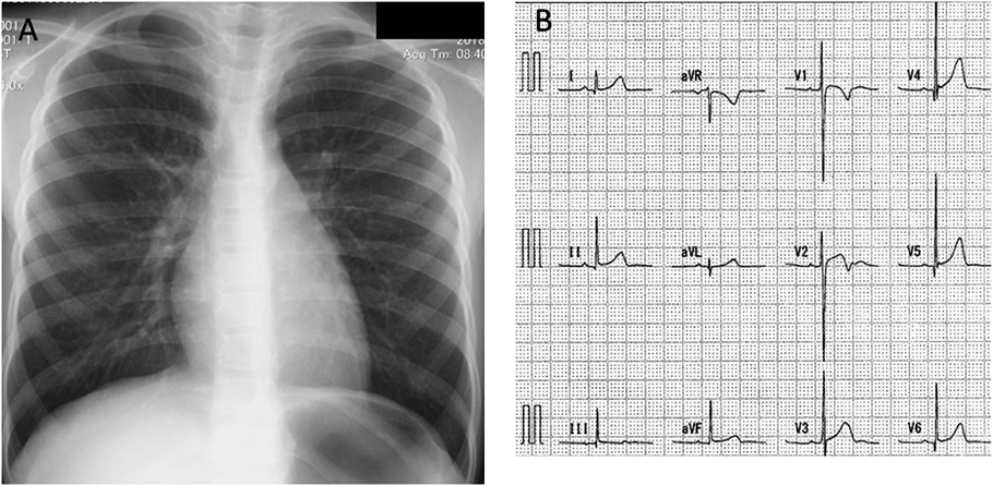 (A) The CTR was 42% with no dilation. Pulmonary angiography findings were normal. (B) The 12-lead electrocardiogram at rest showed a normal range without ST changes.