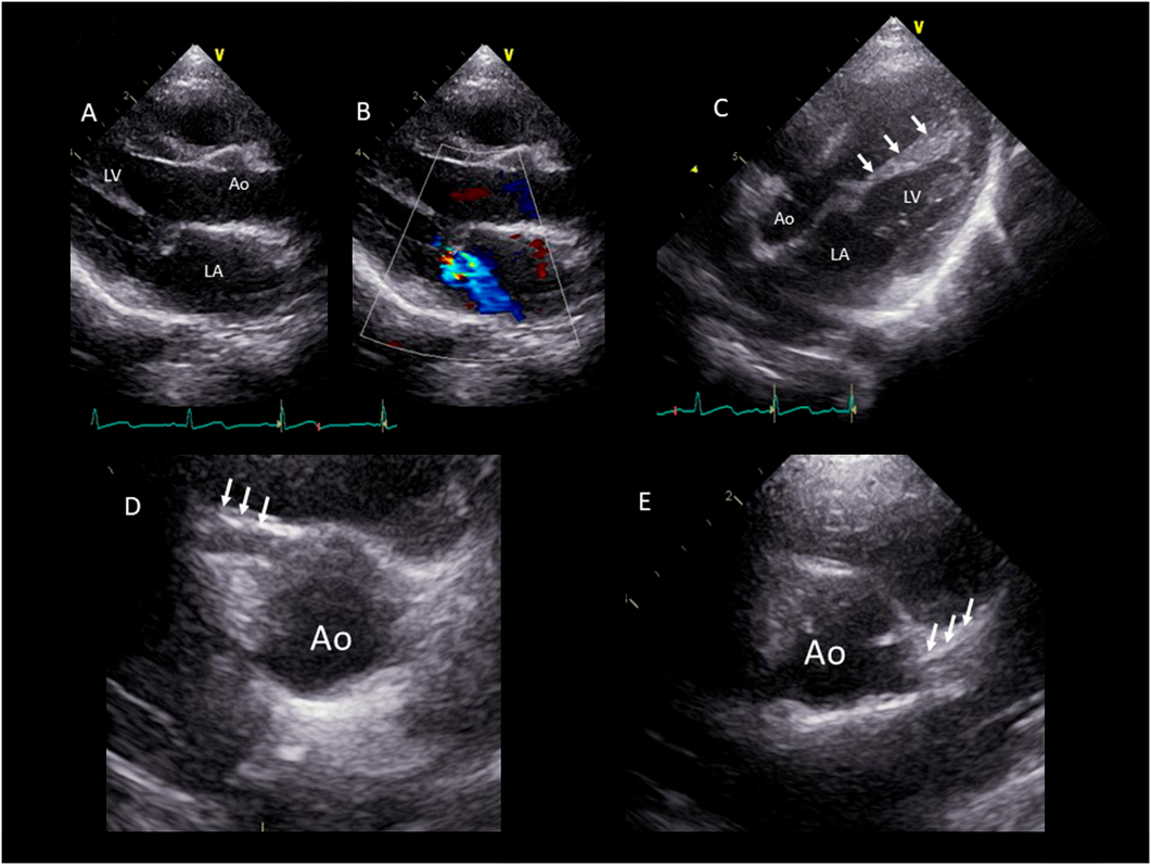 (A) Long-axis view of the left ventricle. The cause of mitral regurgitation was tethering rather than prolapse. (B) The degree of mitral valve regurgitation was moderate according to the Color Doppler method. (C) Five-chamber view of the left ventricle. The high echogenicity of the left ventricular papillary muscle is visualized. (D) The RCA has an enlarged starting point of 3 mm (Z score: 2.7) (arrow). (E) The left coronary artery is thin (arrow) with an unidentifiable origin. Ao, aorta; LA, left atrium; LV, left ventricle.