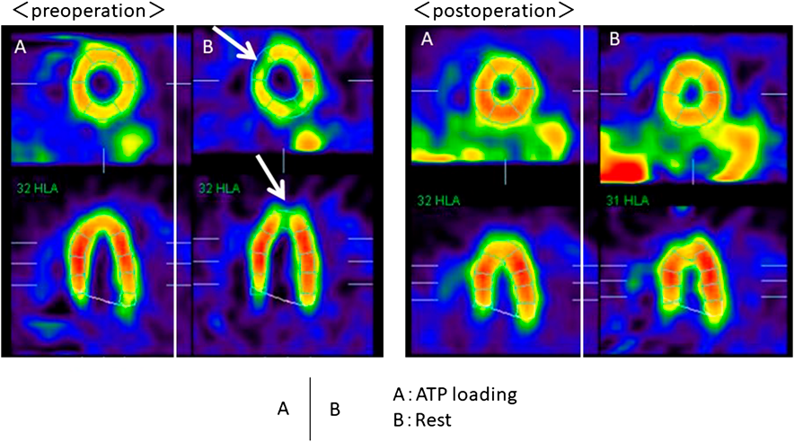 [Before surgery] (A) Under stress: A mild decrease in the myocardial blood flow from the anterior wall to the apex. (B) At rest: The blood flow is further reduced from the anterior wall to the apex of the heart compared to loaded conditions (arrow). [After surgery] The blood flow from the anterior wall to the apex was clearly improved.
