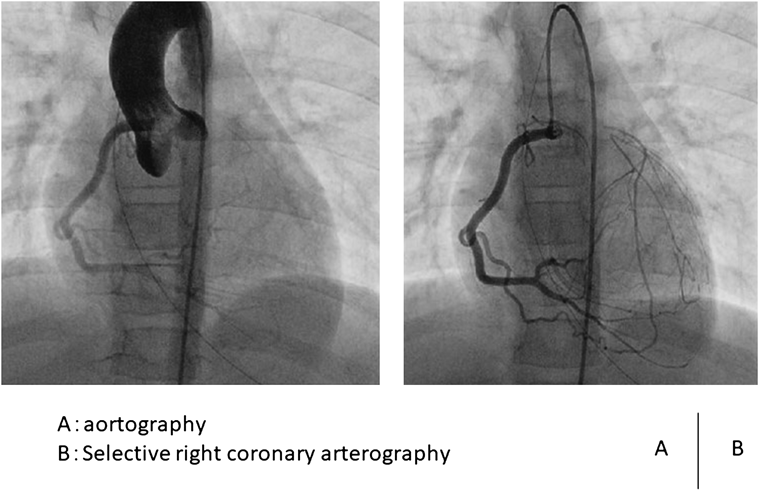 (A) Aortography. The left coronary artery origin was not imaged. Collateral circulation from the right coronary artery to the left coronary artery was imaged. (B) Selective right coronary angiography. The left main coronary artery was imaged via the collateral circulation.