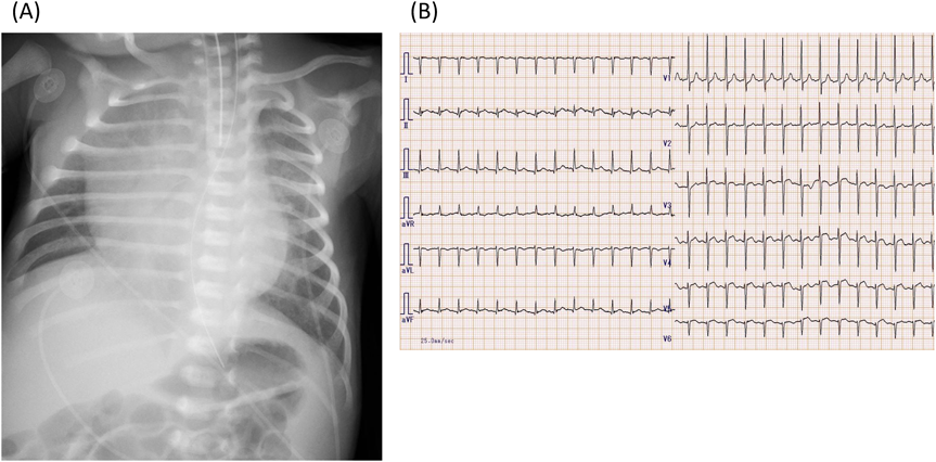 The patient was born at 40 weeks and 1 day of gestation through vaginal delivery with no asphyxia at a birthweight of 2637 g. The mother had no signs of infection during the perinatal period. The patient developed fever on day 2 of life, and was treated with antibiotics until day 6 in light of a possible bacterial infection. On day 7 of life, a gallop rhythm was noted on auscultation. Acute myocarditis was suspected on cardiac ultrasound and treatment with catecholamines and diuretics was commenced. His respiratory condition deteriorated on day 8 and was transferred to our hospital for intensive care on day 9 of life.