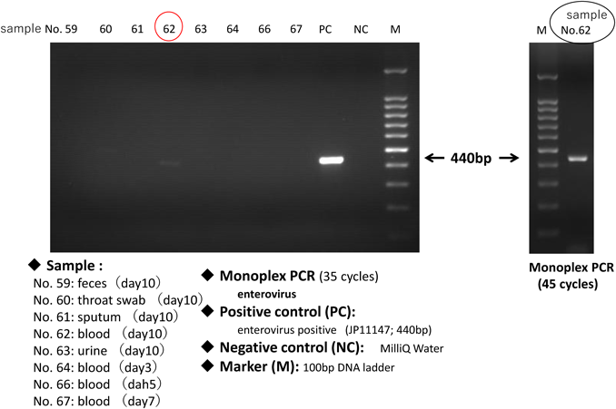 Blood, throat swab, stool, sputum, and urine specimens during the acute-phase stage of the disease tested negative for 11 representative viruses (group A, B, C rotaviruses, adenoviruses, noroviruses I, II, astroviruses, sapoviruses, parecoviruses, enteroviruses, and aichivirus) infecting infants and young children using multiplex (RT-)polymerase chain reaction (PCR). Enteroviruses, which can cause myocarditis, were then analysed using Monoplex RT-PCR and was detected in a sera sample from day 10. The amplified product bands were thin as shown in Fig 3(left) lane 62 (10-day-old sera) in the usual 35 cycles, and sequencing could only be performed by reacting for 45 cycles of the PCR reaction, as shown in Fig 3(right). A BLAST search using the sequence results of the amplified product of this RT-PCR targeting enterovirus 5'-Untranslated region (5′-UTR) revealed that the Cox B3 was at the top of the homology suggesting Cox B3 to be the causative virus.