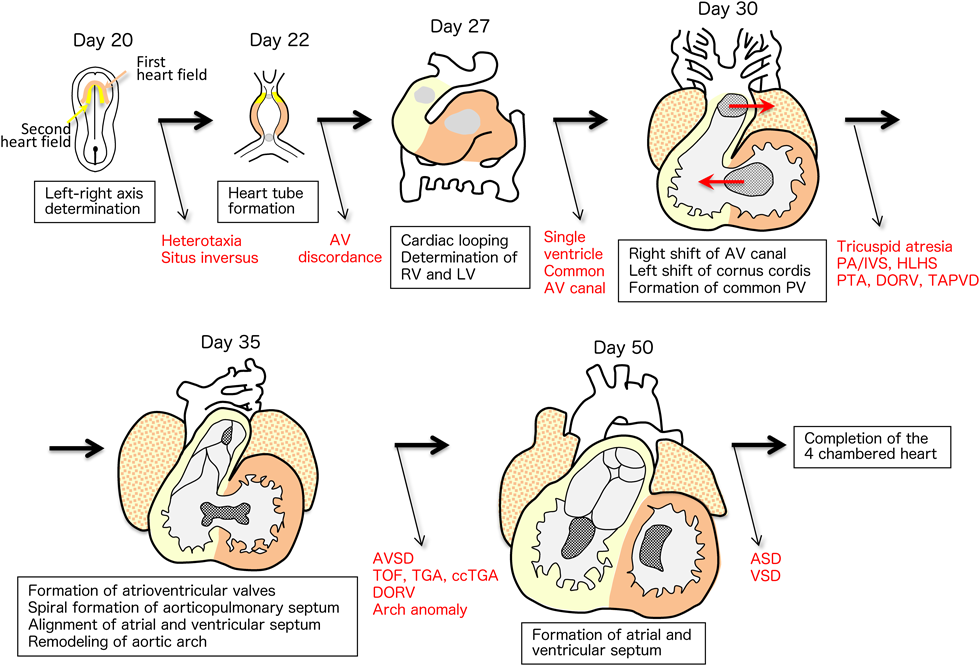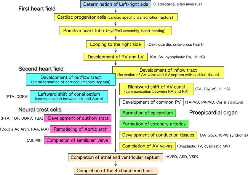 The morphogenesis of the heart is completed in the spatiotemporally-controlled manner shown in this review. The expanding scientific information on embryonic heart development is essential for the diagnosis and treatment of congenital heart disease. Thus, in order to understand the mechanisms of the disease, prevent the initial onset of the disease, and finally improve the quality of life of patients, we must keep investigating the etiology and pathogenesis of congenital heart disease. The information is also essential for the development of regenerative medicine, including the repair and preproduction of cardiovascular tissues.