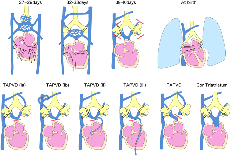 The pulmonary venous plexus develops around the lung bud, which sprouts from the frontal portion of the foregut. The pulmonary venous plexus initially communicates with a systemic venous plexus called splanchnic plexus. On approximately embryonic day 28, the common pulmonary vein protrudes from the posterior wall of the left atrium to form a connection with the pulmonary venous plexus. After that, the communication between the pulmonary venous and splanchnic plexus disappears. If this connection is interrupted, the pulmonary venous blood is unable to drain into the left atrium, resulting in it unavoidably draining into the systemic veins (superior vena cava, coronary sinus, or portal veins). This condition induces total (or partial) abnormal pulmonary venous drainage2–5) (Fig. 11). If the connection between the common pulmonary vein and the left atrium is small, cortriatratum develops. It has recently been clarified that cardiac inflow tract myocardial progenitor cells and pulmonary vascular plexus cells are derived from common progenitor cells (cardiopulmonary mesoderm precursors; CPPs cells), suggesting a relationship with the pathogenesis of pulmonary venous drainage abnormalities.9)