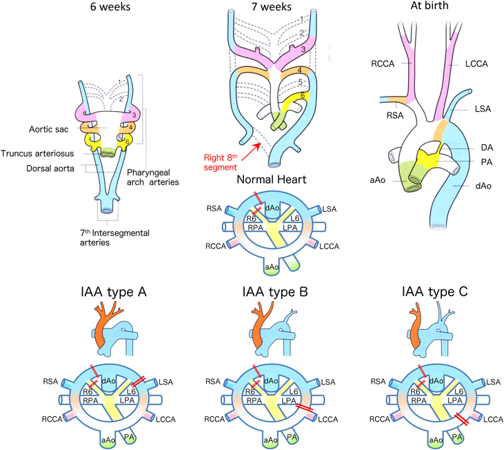 Interrupted aortic arch type A develops when L8 is disrupted, type B develops when L4 is disrupted, and type C develops when the aorta between the left and right common carotid arteries is disrupted. Modified from Reference 5).