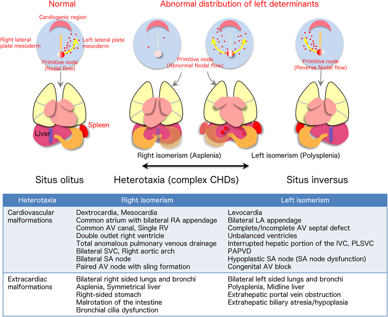 The node pit cells in the primitive node, located in the middle of the three-layered blastoderm, have cilia that rotate in a counterclockwise spiral. Because the cilia are inclined to align caudally, a leftward nodal flow occurs at the top of the node pit cells. Node crown cells sense this flow and upregulate the intracellular calcium level. Then a growth factor, Nodal, is predominantly expressed on the left side of the node, which in turn upregulates growth factors and transcription factors Nodal, Lefty, and Pitx2 in the left lateral plate mesoderm. Subsequently, signals are finally transmitted to the left side of the heart primordium (cardiogenic region). If the left/right determinants are not sufficient in the primitive node, or if the leftward nodal flow is not normal, the left/right information of the organs, including the heart, is not established or randomized. Heterotaxy, right isomerism (splenia) or left isomerism(polysplenia), may develop6) (Fig. 3).