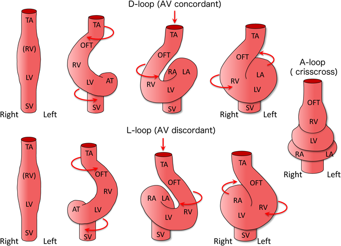 The primordia of the left and right ventricles rapidly bulge as the heart tube elongates. The straight heart tube starts to loop to the right side of the embryo, creating the outer contour of the four-chambered heart (Fig. 4). After completion of the looping process, the circulatory system of the embryo with a series circuit shifts to a parallel one, where the pulmonary and systemic circulations become separated and independent (Fig. 4). If the straight heart tube loops to the “left side” of the body, an inconsistent connection between the atria and ventricles takes place, resulting in “atrioventricular discordance”. Furthermore, when the heart tube loops in the front direction, the normal parallel atrioventricular connection changes to a vertical and torsional relationship, forming “superior-inferior ventricles”. If the atrioventricular connection is extremely twisted, “crisscross heart” is formed.5)