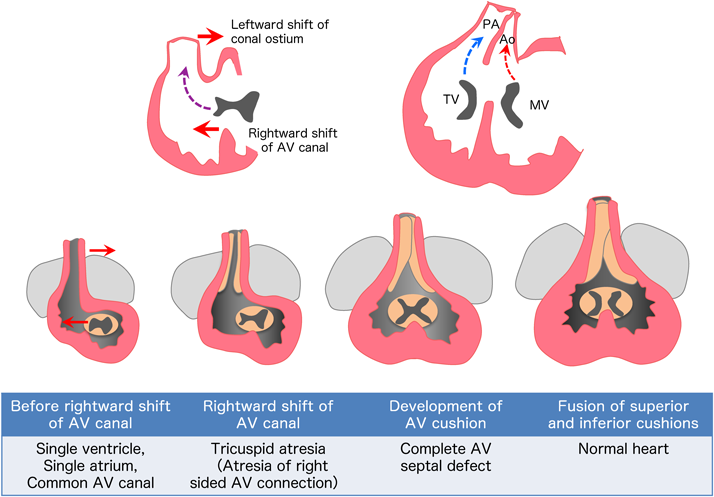 The atrioventricular canal is first located at the left side of the heart tube. Then, upper, lower, left, and right endocardial cushion tissues simultaneously develop, remodeling the atrioventricular canal into an H-shaped orifice. As the rightward shift of the atrioventricular canal progresses, a connection is newly created between the right primitive atrium and ventricle. Eventually, the upper and lower endocardial cushions fuse to separate the tricuspid and mitral valves. If this process is impaired, single ventricle, single inlet of univentricular atrioventricular connection, or complete atrioventricular septal defect develop.