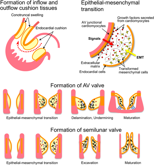 In the atrioventricular canal and the conotruncal regions, differentiation of cardiomyocytes is suppressed to form valve tissues. Signaling molecules that promote epithelial-mesenchymal transition (EMT) are secreted from myocardial and endocardial cells. Abundant interstitial tissues develop in the areas of endocardial cushion and conotruncal swelling (Fig. 6). In the inflow tract, four endocardial cushion tissues develop. Mitral and tricuspid valves are formed through a remodeling process called “undermining”. On the other hand, two (initially four) conotruncal swellings develop in the outflow tract. Interestingly, proximal and distal swellings coalesce in a spatially twisted manner, such that the pulmonary artery and aorta are divided in a spiral manner.2–6)