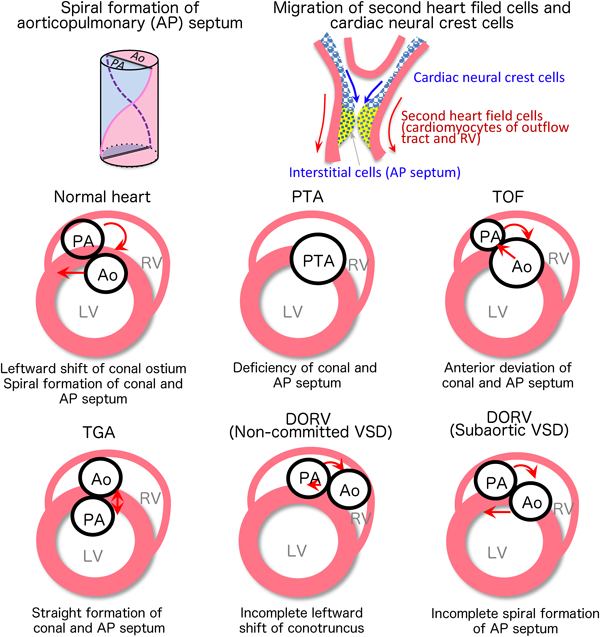 Persistent truncus arteriosus develops when the aorticopulmonary septum is not totally defective. Fallot tetralogy occurs when the aorticopulmonary is anteriorly deviated. Complete transposition of the great arteries develops when formation of the aorticopulmonary septum is straight. Double outlet right ventricular develops when the leftward shift of the conal ostium or spiral formation of the aorticopulmonary septum is incomplete.