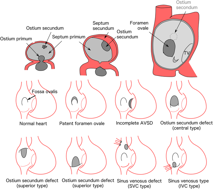 The upper center of the atrium is recessed downward, with the formation of the septum primum on approximately embryonic day 30. It extends downward and leaves a defect hole in the lower end (ostium primum), which is later closed by endocardial cushion tissue. Multiple defects are formed at the higher portion of the septum primum, which assemble to form ostium secundum. As the bilateral atria become bulged, septum secundum is formed on approximately embryonic day 35 to 37. The septum secundum, like the septum primum, leaves a defect hole in the center to the lower end (foramen ovale). The thin septum primum works as a valve between the right and left atria to make unidirectional blood flow from the right to the left atrium. When the baby starts to breathe, a large amount of pulmonary venous blood returns to the left atrium, causing the primary septum to be compressed from the left atrium, which enhances the closure of the foramen ovale (Fig. 8). The classifications of atrial septal defects include patent foramen ovale, ostium primum defect, ostium secundum defect (upper edge defect, foramen ovale defect, lower edge defect), and sinus venosus defects (superior vena cava defect, inferior vena cava defect). Sinus venosus defects are thought to be induced by fusion of the right upper or lower pulmonary veins and superior or inferior caval veins in the early stages of heart morphogenesis.2–5)