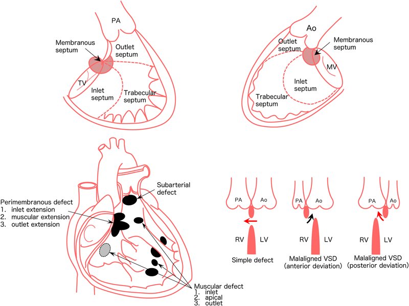 In terms of frequency, perimembranous defects are the most common, accounting for approximately 50% of ventricular septal defects. Septal defects are also classified into two types: simple defects and malaligned defects.1, 5)