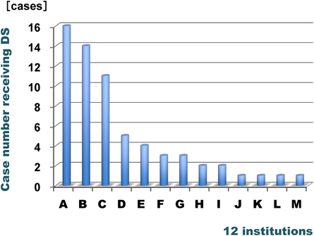 We received the replies from 28 of the 35 institutions. Of these, DS was performed in 64 cases at 12 institutions in the three years. The purpose of DS was to maintain systemic circulation in 62 cases and to do pulmonary circulation in the remaining 2 cases. Therefore, we describe DS performed for maintaining systemic circulation in these cases. The number of DS procedures in each institution is shown in Fig. 1. The top three institutions performed >10 procedures during the 3 years. Table 2 represents the characteristics of 62 patients having undergone DS. Major indications for performing DS were patients with a high risk for alternative surgery such as Norwood or urgent stenting owing to the closure of AD despite of the use of PGE1; the percentage of DS performed because of these indications was 82%. However, DS was also performed based on each institutional principle (18%). In this setting, the patient does not always have a high risk for the alternative procedure. Patient diagnosis indicates that approximately 63% of the patients exhibited univentricular physiology, and the remaining had biventricular physiology. The median age and weight of the patients at the time of DS were 21 days old and 2.8 kg. Bilateral pulmonary artery banding was performed prior to DS in 38 cases (61%). Catheter interventions were performed prior to DS in 15 cases (24%), which included balloon atrial septostomy in 10 cases with univentricular physiology, balloon aortic valvuloplasty in 4 cases with critical aortic stenosis, and pulmonary artery band dilation in 1 case.
