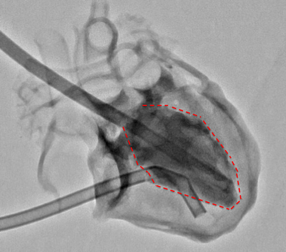 To accurately measure the ventricular volumes of each model (seven ventricles), the valves of each ventricle were closed with glue and VSD patch closure was performed. Then, a 10-fold diluted contrast medium was injected into each ventricle through the tube. A cardio-angiography apparatus was used to capture the contrast agent in each ventricle. The amount of the contrast medium that filled the ventricle was defined as the absolute volume. The ventricular volume was measured with Cath, CT, and MRI using the same liquid. Then, these measured values were compared with the absolute volume.