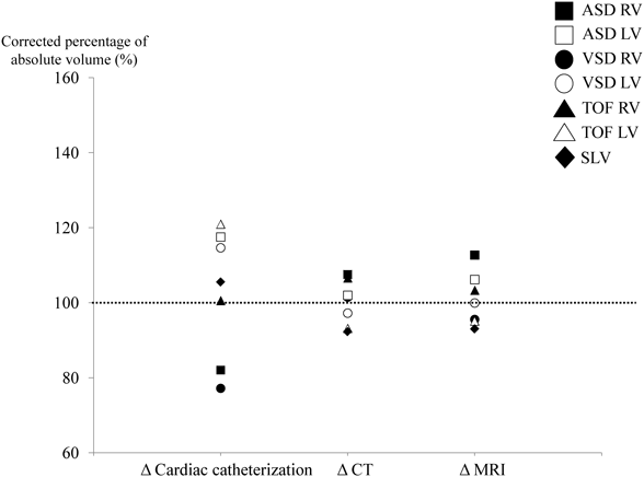 | All parameters are expressed as mean±SD. Parenthesis: measured volume was expressed as a percentage of absolute volume. ASD, atrial septal defects; VSD, ventricular septal defects; TOF, tetolalogy of Fallot; SLV, single left ventricles |