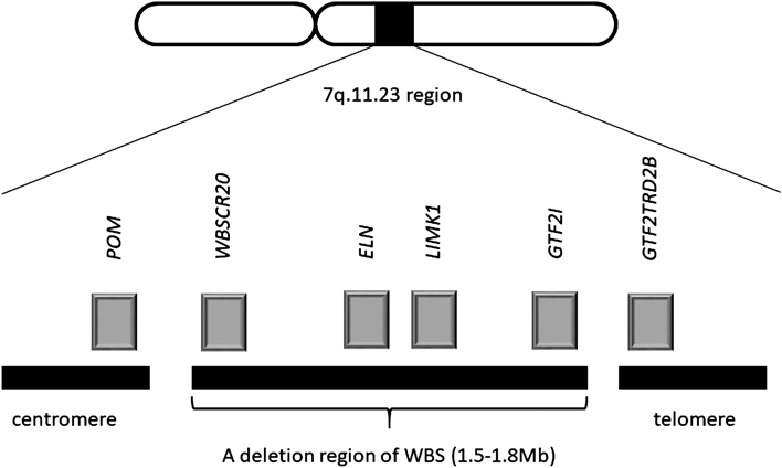 Williams-Beuren syndrome (WBS) is contiguous gene syndrome caused by microdeletions of 7q11.23 and features cardiovascular lesions (supravalvular aortic stenosis [SVAS] and peripheral pulmonary artery stenosis [PPS]), distinctive facies (thick medial eyebrow, blepharophimosis, epicanthus, puffy eye, short and turned-up nose, long philtrum, opened thick lips) and specific cognitive profiles (specialty of the expressed languages, recognition of faces and music and poor visuospatial perception). The frequency of WBS has been estimated to be 1: 7500–20000, no gender differences, and the majority of them is sporadic. The prognosis of WBS without cardiovascular lesions is relatively favorable.1) The chromosome 7q11.23 includes several genes, ELN and GTF2I (Fig. 1), and ELN is responsible for expressions of the elastin which is the main component of elastic fibers. The elastin is comprised of systemic connective tissue, aorta, lungs, skins and ligaments, and the abnormal expressions of elastin according to ELN mutation induce various symptoms, example for vascular wall thickening. The past reports of ELN failure are accompanied with WBS and SVAS (familial and sporadic).