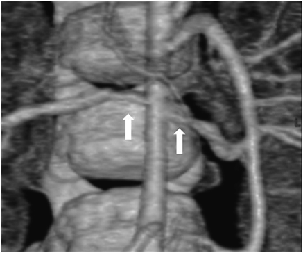 Her state was stable without particular interventions until echocardiography showed the signs of right heart failure at six days after birth, and we began diuretics (furosemide [1 mg/kg/day] and aldactone [1 mg/kg/day]). She was discharged at twenty days after birth since SVAS and PPS did not proceed. She was a normal psychomotor development, smiling at two months old, head controlling at four months old, sitting at seven months old and crawling at nine months old. The distinctive facies and the undeveloped recognition were not seen in follow-up periods. At ten months old, she was hospitalized and received cardiac catheterization for consideration of treatment policy. Cardiac catheterization revealed that the pressure gradient was right atrium-right ventricle, bilateral peripheral pulmonary arteries-main pulmonary artery and left ventricle-ascending aorta. Estimated pressure gradient between left ventricle and ascending aorta was 40 mmHg and cardiac contractility was sufficient (Table 1), so we decided to manage her without surgical interventions. For hypertension, we performed Multi Detector-row Computed Tomography and discovered bilateral renal artery stenosis (Fig. 2). She had high renin/angiotensin ratio (plasma renin activity was 59.5 ng/mL/hr [reference range; 0.2–2.7 ng/mL/hr] and plasma aldosterone concentration was 128 ng/dL [reference range; 2–13 ng/dL]), and we diagnosed her renovascular hypertension and started carvedilol.