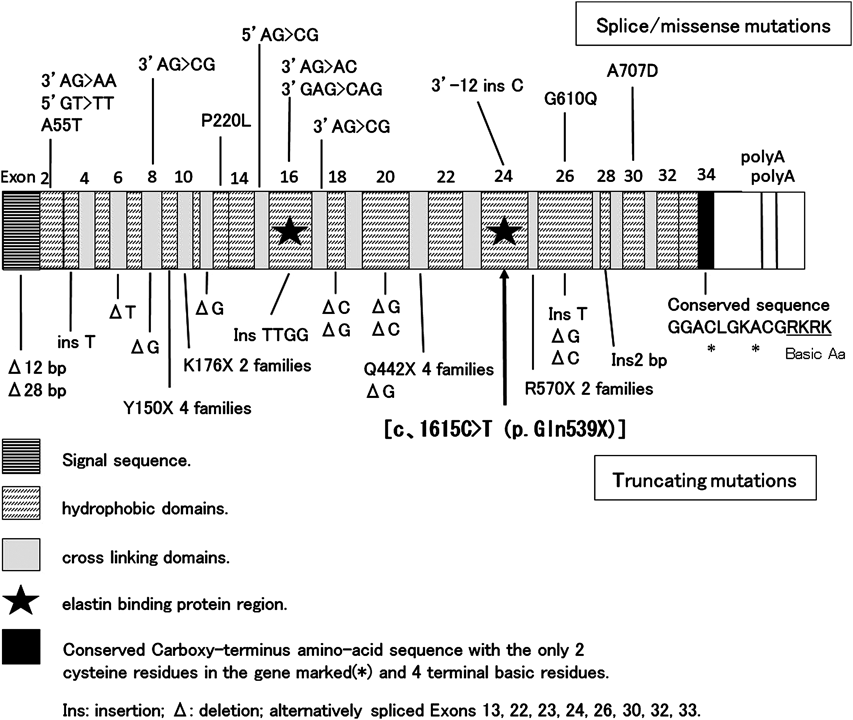 We present the case with a nonsense mutation in heterozygote of ELN [c.1615C>T (p.Gln539X)], that has never been reported before. Among ELN mutations, many cases with missense mutation have relatively mild cardiovascular lesions and many cases with nonsense mutation or frameshift mutation have severe cardiovascular lesions. In addition, since Exon 16 and Exon 24 contain elastin binding protein region and severe cardiovascular lesions (SVAS, PPS, aortic hypoplasia) are observed in cases with Exon 16 mutation (frame shift), it is suggested that a deletion at Exon 16 or Exon 24 tends to cause more severe cardiovascular lesions. In this case, in addition to SVAS, PPS and supravalvular pulmonary stenosis, bilateral renal artery stenosis was also observed, and renal artery stenosis is rare in the past reports. A nonsense-mediated RNA decay is also considered for nonsense mutation, but in this case, because of nonsense mutation of Exon 24 which has an important role among ELN genes, it is considered that serious quantitative or qualitative change of elastin were caused and cardiovascular lesions characteristic of WBS and other widespread cardiovascular lesions developed by this ELN mutation.9)