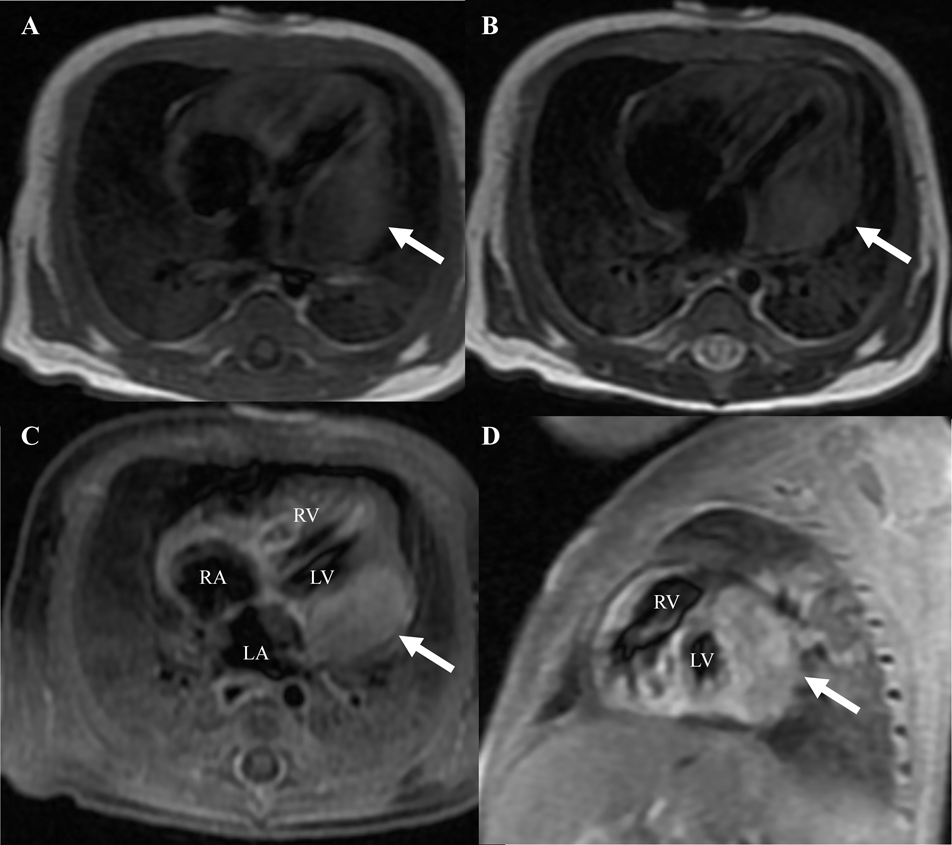 A 37-year-old pregnant woman in the 36th week of gestation (gravida 1, para 0) was transferred to our hospital due to a fetal cardiac mass noted during fetal echocardiography. Her fetal echocardiographic examination showed a large homogeneous, hypoechoic mass (24.0×16.7 mm), occupying the left ventricular cavity almost completely (Fig. 1). Other cardiac abnormalities were not detected. A male neonate was born via uncomplicated vaginal delivery at 36 weeks and 4 days of gestational age, weighing 2,896 g, the 1- and 5 minutes Apgar scores both 8. At birth it is found crying vigorously and spontaneously with good cardiorespiratory adaptation, tone and reactivity appropriate for gestational age. On physical examination, blood pressure was 58/34 mmHg, pulse regular with a rate of 132/min, breathing rate 54/min, transcutaneous oxygen saturation 94% in room air, and body temperature of 37.2°C. The initial cardiac examination revealed no significant murmur and typical facies associated with Down syndrome. Genetic testing confirmed karyotype 47, XY+21. Laboratory data, including plasma level of brain natriuretic peptide (BNP) and cardiac enzymes levels, were unremarkable. The plasma BNP level was 94 pg/mL (normal, <18.4 pg/mL). An electrocardiogram demonstrated sinus rhythm, right axis deviation, and low QRS voltage in V 5-6. A chest X-ray was negative for cardiomegaly with a cardiothoracic ratio of 0.59 but revealed a mild prominent bulge on the left cardiac border. Echocardiography revealed a large, solitary, homogenous mass contiguous with the left ventricular free wall and the left atrial wall, remarkably without evidence of ventricular systolic dysfunction (Fig. 2). There was no left ventricular inflow or outflow obstruction by Doppler interrogation. A chest contrast-enhanced Computed tomography (CT) showed a well-defined, homogenous, hypodense lesion bulging into the left ventricular and atrial cavity. No foci of calcification were identified. In addition, a CT scan of the head showed no evidence of calcification. Magnetic resonance imaging (MRI) of the chest showed a single large isointense mass in the left ventricular free wall on T1- and T2-weighted imaging. The solid component of the mass exhibited a slight enhancement following gadolinium administration (Fig. 3). Finally, these images summarized the signal intensity of nonspecific soft-tissue mass. Although we considered fibroma or rhabdomyoma would statistically be the most common etiology, tissue characteristics were not compatible with known benign or malignant masses.
