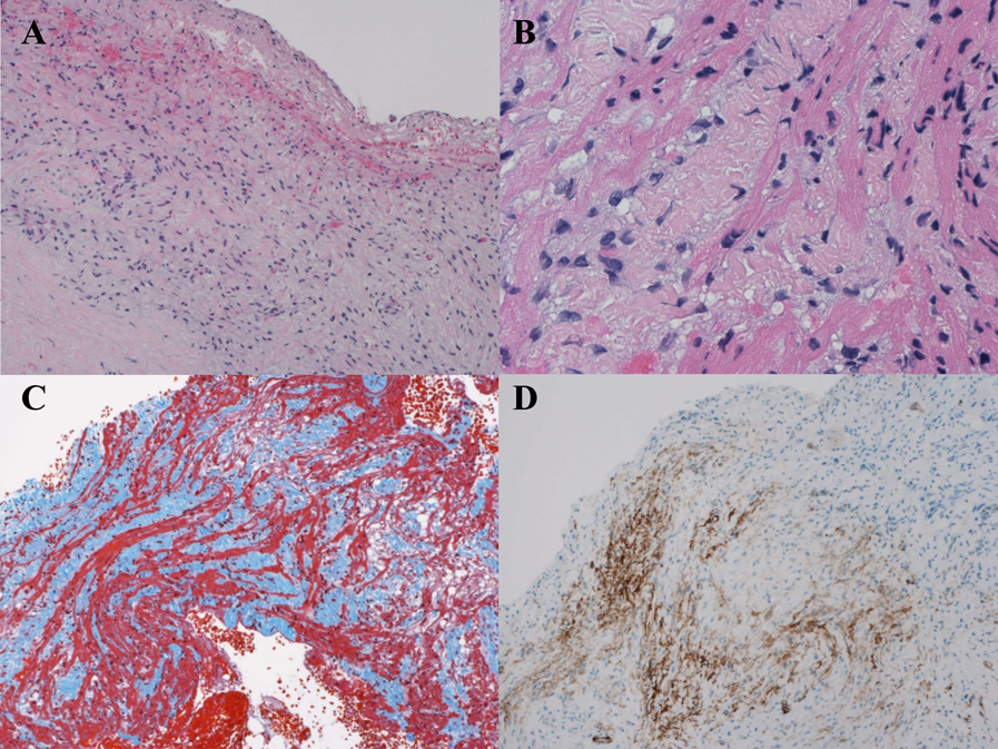 At 44 days of life, the patient was scheduled for open surgical biopsy to establish a diagnosis of the cardiac mass and determine whether it has malignant potential. Surgical open biopsy was performed through median sternotomy without cardiopulmonary bypass. A light yellow tumor appeared to originate from the left ventricular posterior wall near the base (Fig. 4). 3 biopsy specimens approximately 2–3 mm in size were obtained. Histopathologic examination demonstrated disarray of spindle cells with nuclei that appear to be normal (Fig. 5a, b) and increased amount of collagen fibers between cardiomyocytes (Fig. 5c). Immunohistochemical staining was positive for alpha-smooth muscle actin (Fig. 5d) but negative for desmin, CD31, and myogenin. The histological examination was compatible with a benign fibroma.