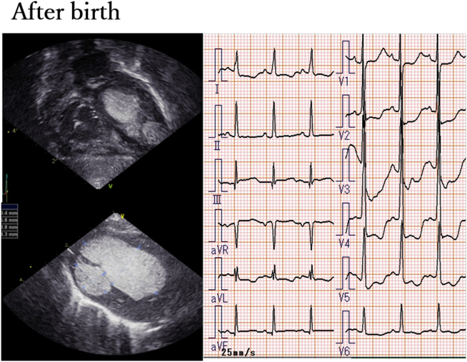 A female child was born at 39 weeks to a 27-year-old woman without any relevant family history. She was the first child of an unrelated healthy couple. Neither her parents nor relatives had tuberous sclerosis. Screening at 25 weeks of gestation using ultrasonography revealed a cardiac tumor, and she was referred to our hospital at 28 weeks of gestation. At 34 weeks of gestation, magnetic resonance imaging revealed TSC as a definitive diagnosis, with multiple nodules around the lateral ventricles and cardiac rhabdomyomas. There were multiple heart rhabdomyomas, and in particular, a large tumor occupied the left ventricle. Because of concerns regarding circulation after birth, delivery was planned at 39 weeks of gestation. Her parents were informed that the tumor was considerably large for her to survive without early surgery and that everolimus might help avoid or delay surgery. Her parents requested for the use of everolimus at birth, and permission was granted by the TSC board and the Ethics Committee of Juntendo University (approval No.: 16-0027). We planned to use everolimus for survival in case of heart failure. At 39 weeks of gestation, she was born via normal vaginal delivery. Her Apgar scores at 1 and 5 min were 9 and 9, respectively. Her birth weight was 2,844 g, heart rate was 116 beats/min, blood pressure was 65/32 mmHg, and oxygen saturation was 95% with room air. Physical examination revealed mild cyanosis and mild hepatomegaly. We noted a grade 2–3/6 systolic ejection murmur, which was best heard at the left sternal border. Transthoracic echocardiography demonstrated multifocal echogenic masses. There were 2 masses in most of the left ventricle (apex to outflow; 30.4×15.6 mm at the interventricular septum side and 13.8×8.3 mm at the posterior wall side), resulting in mild outflow obstruction; 3 masses at the right ventricular apex and inflow and outflow tracts (12.6×8.4 mm, 5.0×6.0 mm, and 4.7×2.7 mm, respectively); and 1 mass at the right atrial appendage (4.5×5.4 mm). The left ventricular ejection fraction could not be measured by M-mode echocardiography because of the large left ventricular mass. The blood flow of the left and right ventricular inflow and outflow tracts was smooth. The flow rates of the left and right ventricular outflow tracts were 1.08 and 0.98 m/s, respectively. In a parasternal 4-chamber view, there was no dilatation of the atrium or ventricle. The estimated right ventricular pressure was almost equal to the left ventricular pressure. A small foramen ovale with left-to-right shunting and ductus arteriosus with bidirectional shunting were detected.