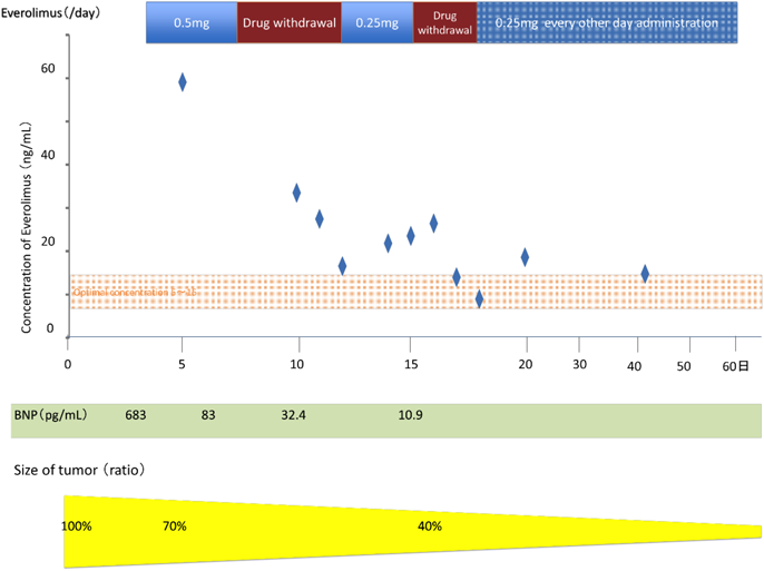 After treatment initiation, the BNP level and tumor size decreased. It was difficult to maintain the everolimus level at an optimal value.