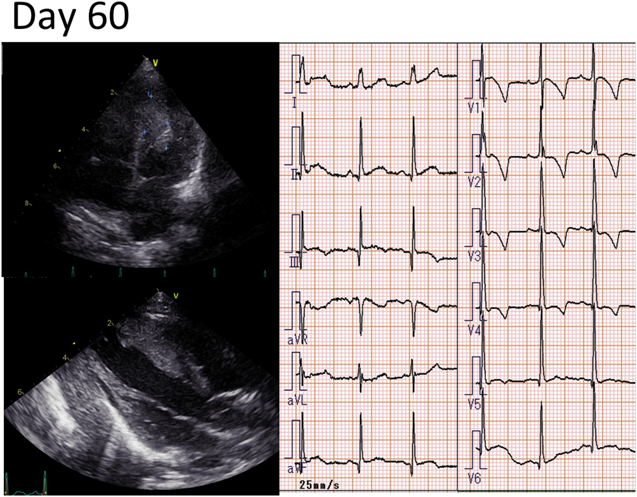 Echocardiography shows that the right and left ventricle cardiac tumors are almost one-quarter of the original sizes, and there is no obstruction of the inflow and outflow tracts. On electrocardiography, there is no low ST level or negative T wave. QTc=390 ms (slightly shortened).