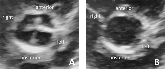(A) At the diastole: four cusps differing only slightly in size are noted. The coaptation line between the left anterior and the left posterior leaflets is thickened. (B) At the systole.