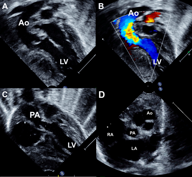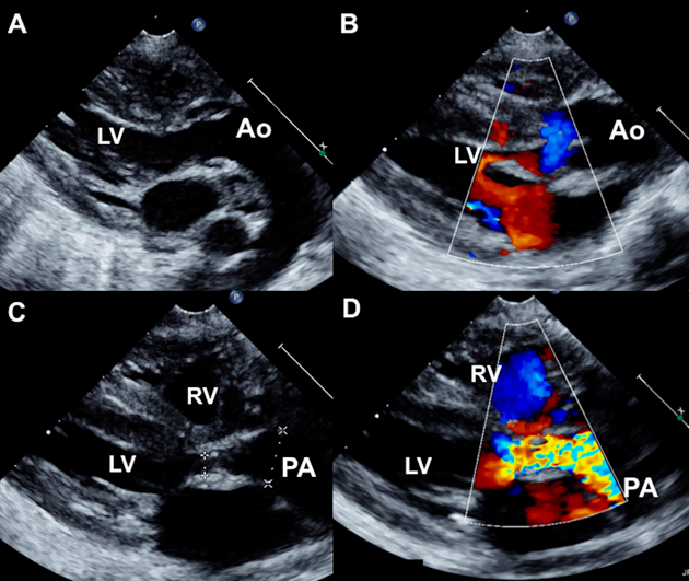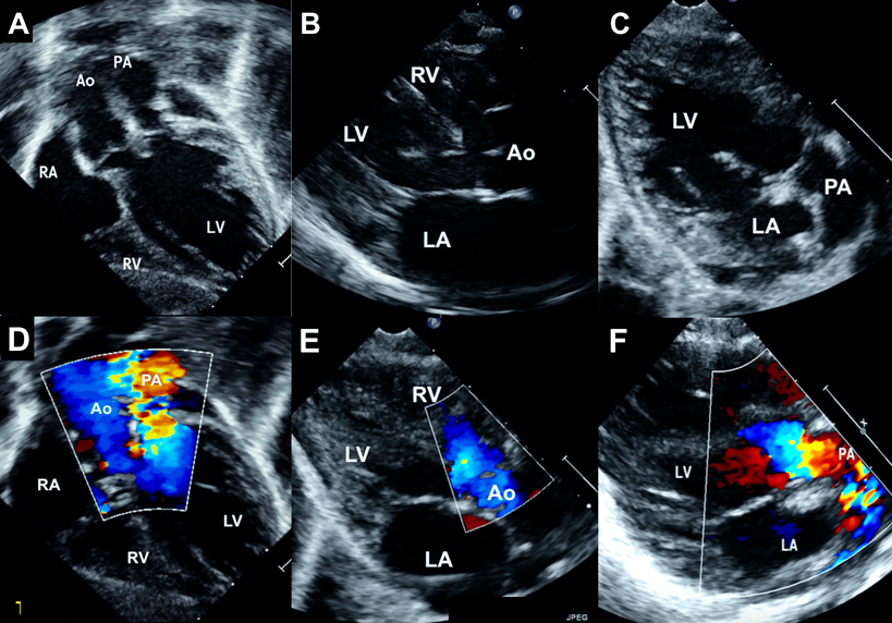 A 2-month-old female infant weighing 2.5 kg with severe cyanosis and oxygen saturation of 58% was diagnosed as DOLV, large subaortic VSD with 30% aortic override, severe annular pulmonary stenosis with peak gradient of 73 mmHg (Fig. 3). Both great arteries were almost completely arising from the left ventricle. The malposed aortic root was left and anterior to the pulmonary artery (Fig. 4). The clinical presentation mimicked transposition of great arteries and pulmonary stenosis with poor inter circulatory mixing. He was planned for staged surgery with initial aortopulmonary shunt to provide additional pulmonary blood flow along with atrial septectomy to improve intercirculatory mixing of blood. The parents declined surgery.
