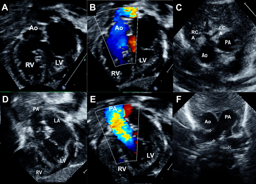A male infant aged one month weighing 4.1 kg presented with central cyanosis and oxygen saturations of 70%. Echocardiography revealed DOLV where both great arteries were arising entirely from the left ventricle (Fig. 1). A subaortic VSD associated with 50% aortic override streamed right ventricular blood into the ascending aorta. There was no conal tissue and both semilunar valves were in direct fibrous continuity with the mitral valve. The oxygenated blood from the left ventricle streamed into the unobstructed pulmonary artery. The great artery relation was normal and a single coronary artery was seen from the anterior aortic sinus (Fig. 2). During surgery at one month of age, the right ventricle was routed to the right and posterior aortic root by a VSD patch followed by an arterial switch operation, coronary transfer without any Lecompte manoeuvre. At a follow-up of six years, the patient was doing well.