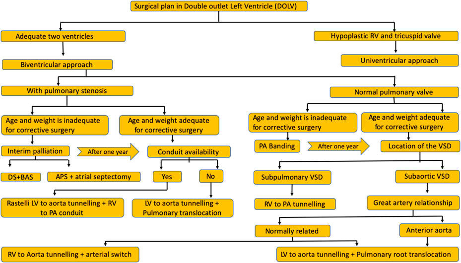 Double outlet left ventricle is most commonly associated with subaortic ventricular septal defects, but may present with large anatomical variations. Patients with pulmonary stenosis have severe cyanosis due to additional unfavourable streaming and clinical presentation is earlier than Fallot’s tetralogy. Patients with unobstructed pulmonary flows show transposition physiology. Treatment algorithms depend on the age of the patient, location of the ventricular septal defect, presence of pulmonary stenosis, great artery relationship, availability of conduits and adequacy of the right ventricle.