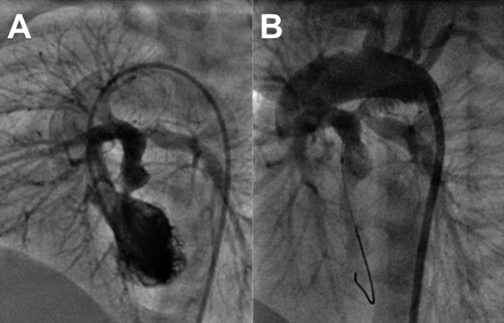 Surgery in DOLV in the presence of pulmonary stenosis depends on the age of the patient. Commonest repair option in patients with subaortic VSD beyond infancy is Rastelli surgery to route left ventricle to aorta and connect pulmonary artery to right ventricle through an extracardiac valved conduit.7) Pulmonary artery translocation after suture closing the stenosed pulmonary valve is another option if conduits are unavailable. Small infants may be palliated temporarily till definitive surgery. Provision of additional pulmonary blood flow may be achieved with an aortopulmonary shunt or percutaneous stenting of the ductus arteriosus. Improvement of intercirculatory mixing to prevent unfavourable streaming may be achieved by surgical atrial septectomy or percutaneous balloon atrial septostomy. One additional patient in our center with DOLV, subaortic VSD, d-malposed aorta was initially palliated in neonatal period with ductal stenting and balloon atrial septostomy (Fig. 6) followed later at one year with Rastelli surgery.