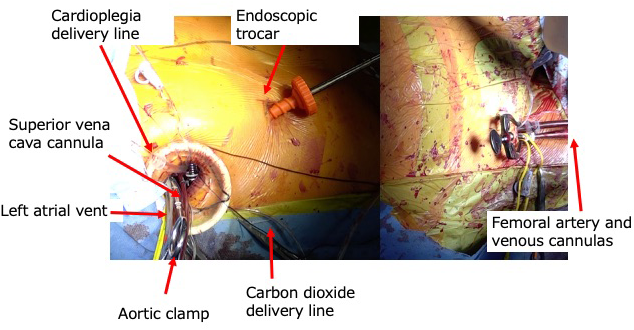 One problem, associated with an open-heart surgery thorough a thoracotomy, is an insufficient de-airing of the heart. In this case, de-airing was achieved thorough the cardioplegia needle hole after closing the atrium. Complete removal of the air was confirmed by transesophageal echocardiogram. As was already mentioned, a carbon dioxide delivery tube was placed inside the chest cavity. As a result, a ST-T segment elevation was not observed after removal of the aortic clamp.